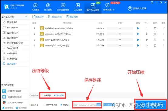 ③ 我们在页面下方设施压缩等级,设置一下压缩后的保存位置,点击【开始转换】,图片就压缩成功啦。
