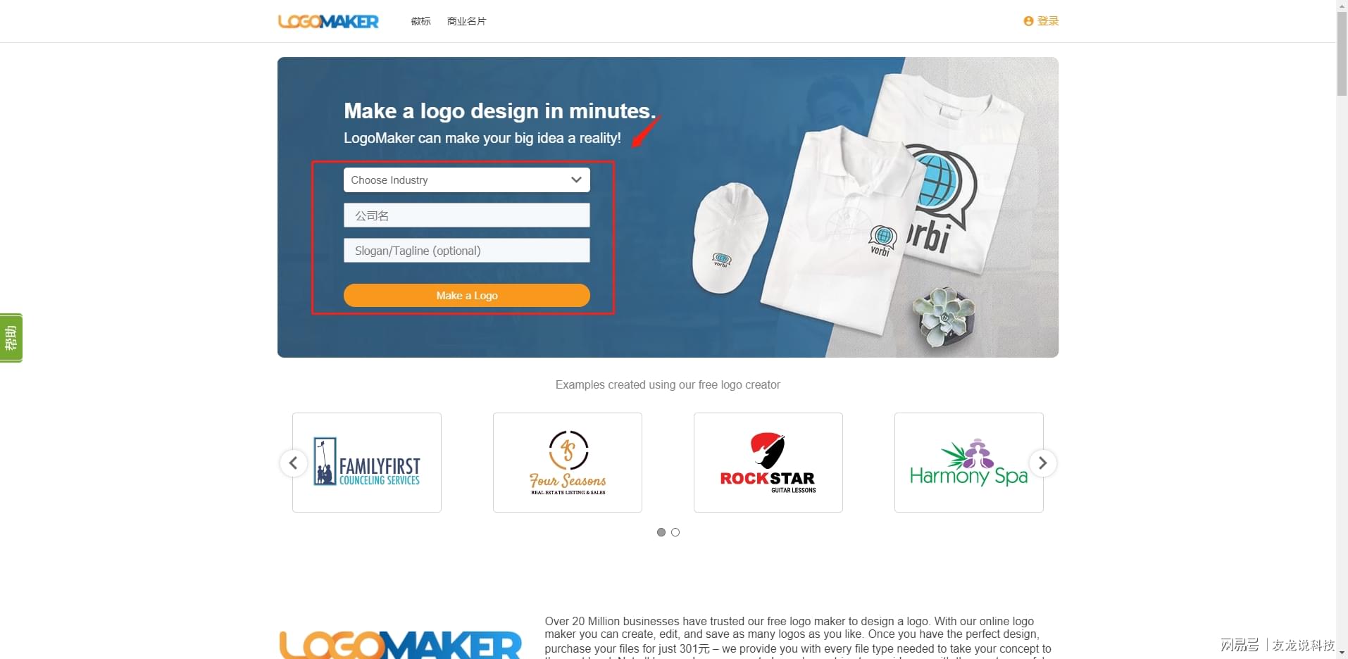 我们打开网页后,能看到几个个空的选框,我们第一个选择行业,第二个选择公司的名称,第三个选择公司的口号,之后我们就可以直接去制作了,全英文很难看懂在这里就不太演示了。