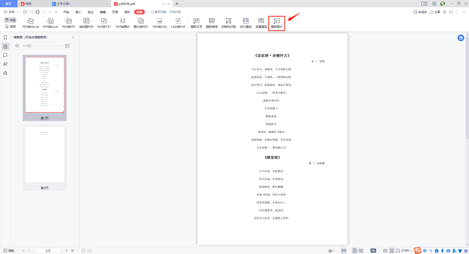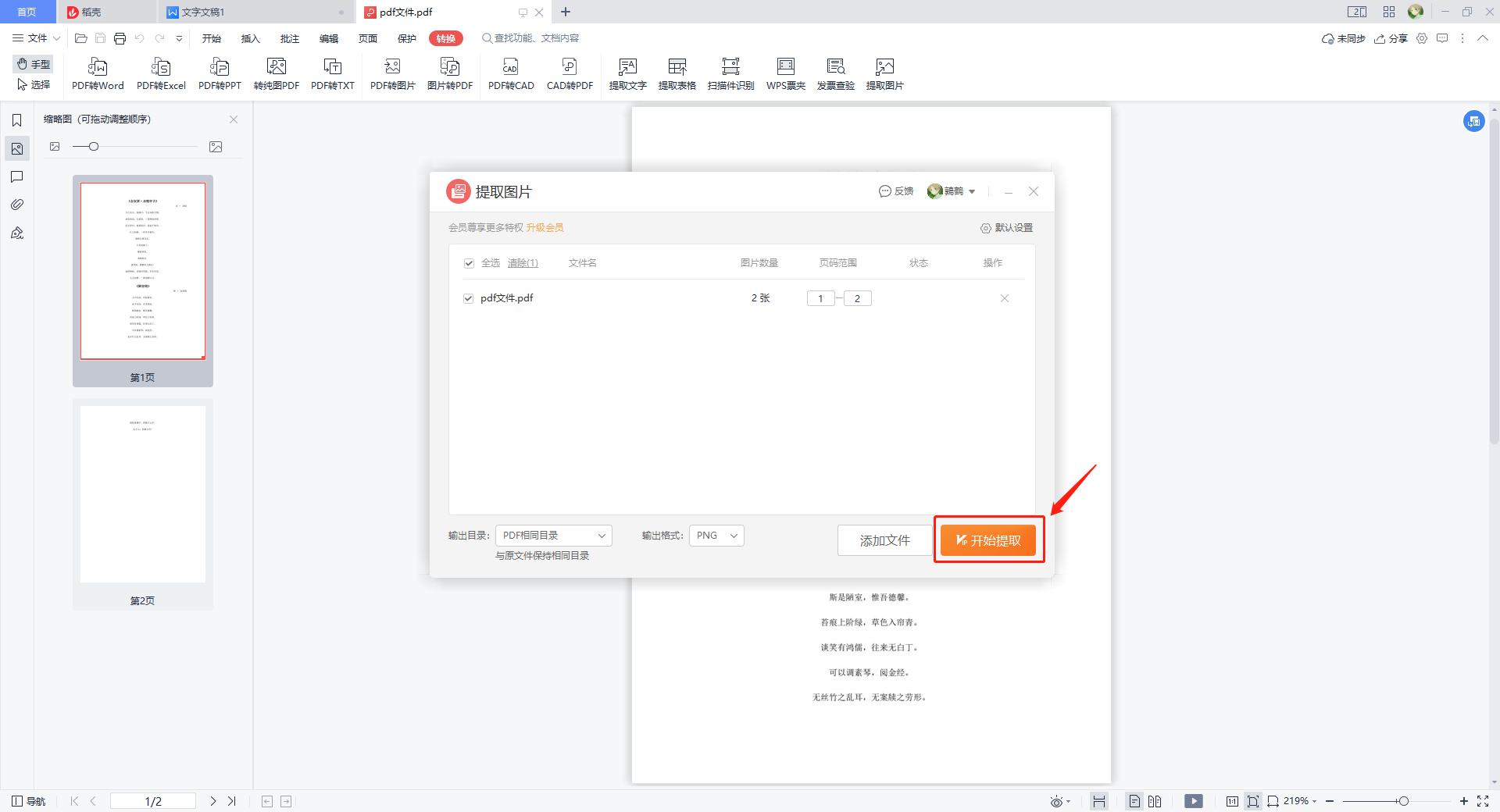 一、首先我们需要打开WPS,也是我们日常用的比较广泛的,接着我们需要将PDF文件在WPS中打开,打开后,我们在上面找到【转换】这个选项,也是非常好找,就这保护旁边就是,找到了之后,在工具栏上就会显示出,各种PDF转换格式选项,我们就能看到提前图片的选项了,在最后一排。