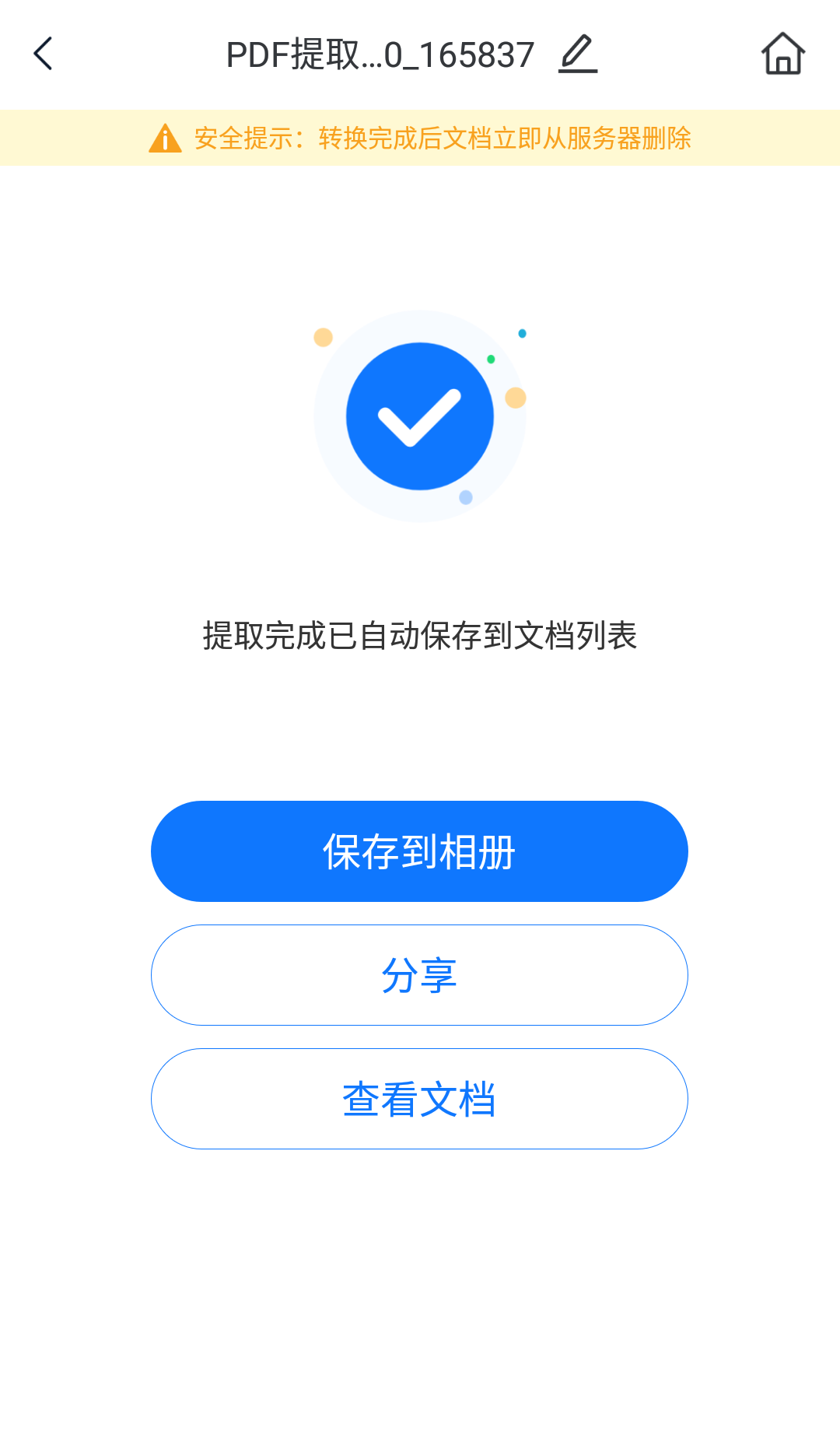 二、上传完成之后,我们就能看到成功的界面了,它会自动的帮你保存到文档列表里,我们可以选择保存到相册,也可以选择直接的查看文档,总之怎么方便怎么来就好。