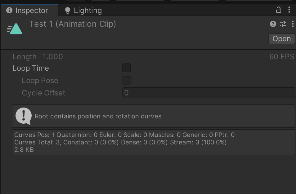 如题的问题,我在2020版本上进行制作了一个动画片段test1.anim 文件,在编辑器下是正常的: