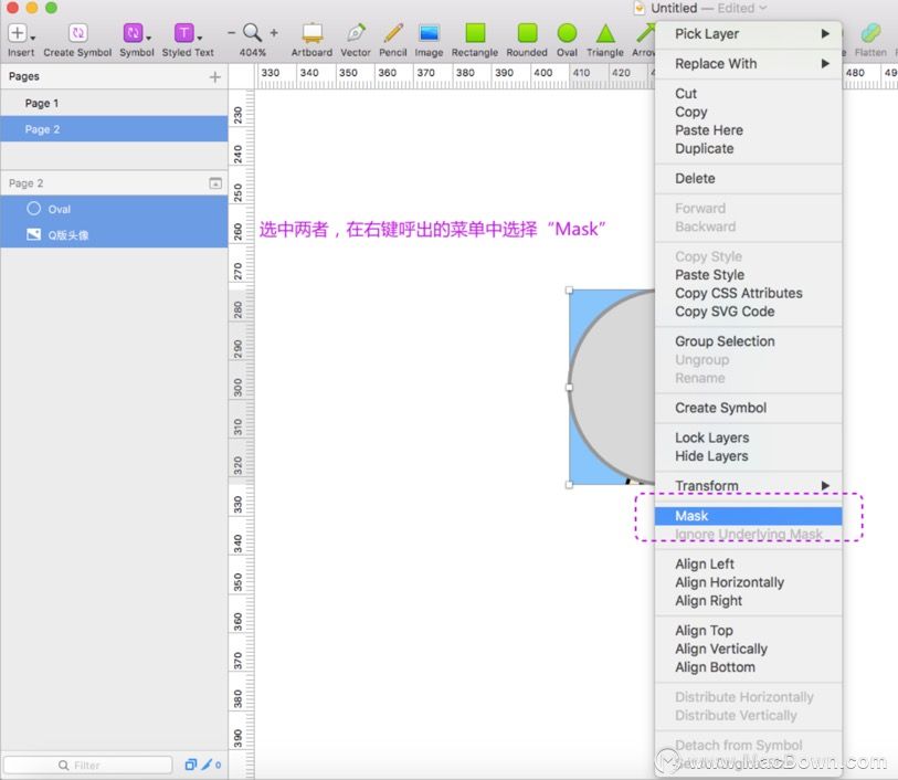 (3)选中头像图片和圆形,在图像上右键点击,在弹出的菜单中选择“Mask”即可