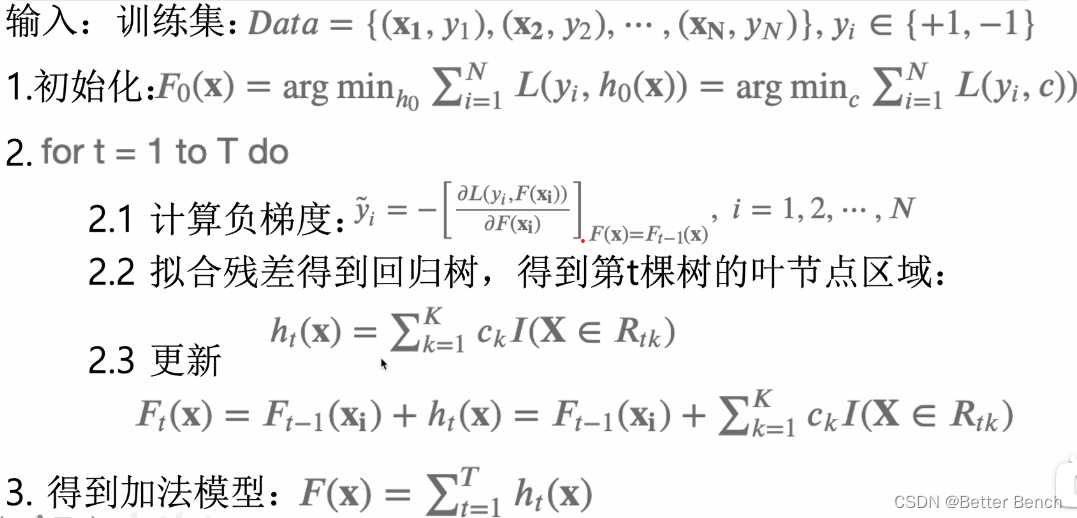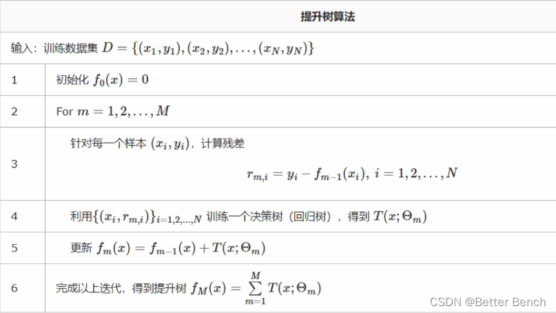 BDT提升树:是以CART决策树为基学习器的集成学习方法。实际上就是加法模型和前向分布算法 f 0 ( x ) = 0 , 初始化提升树 f m ( x ) = f m − 1 + T ( x , θ m ) ,迭代 m 次,包含 m 棵决策树的提升树 f M = ∑ m = 1 M T ( x , θ m ) ,包含 m 棵决策树的提升树 f_0(x) = 0,初始化提升树\\ f_m(x) = f_{m-1}+T(x,\theta_m),迭代m次,包含m棵决策树的提升树\\ f_M = \sum_{m=1}^MT(x,\theta_m),包含m棵决策树的提升树 f0(x)=0,初始化提升树fm(x)=fm−1+T(x,θm),迭代m次,包含m棵决策树的提升树fM=m=1∑MT(x,θm),包含m棵决策树的提升树 在前向分布算法第m步时,给当前的模型 f m − 1 ( x ) f_{m-1}(x) fm−1(x)求解,最小化损失函数: m i n ( ∑ i = 1 N L ( y i , f m − 1 ( x ) + T ( x , θ m ) ) min(\sum_{i=1}^NL(y_i,f_{m-1}(x)+T(x,\theta_m)) min(i=1∑NL(yi,fm−1(x)+T(x,θm)) 得到第m棵决策树 T ( x , θ m ) T(x,\theta_m) T(x,θm)。不同问题的提升树的区别在于损失函数的不同,如分类用指数损失函数,回归使用平方误差损失。