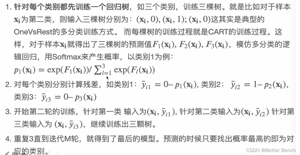 (7)分类问题中,GBDT仍然使用CART回归树作为基学习器,使用Softmax进行概率的映射,然后对概率的残差进行拟合。所以算法过程如下。