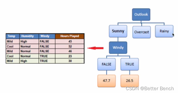 从左边的表可知,Rainy分支的变化系数CV=22%,需要继续分支。再来计算下一个特征的(Rainy节点标准方差-特征的条件标准方差),从右边的表格知道,Temp这个特征的差值最大,则以Temp作为Rainy节点之后的新节点。分支得到以下的树结构。