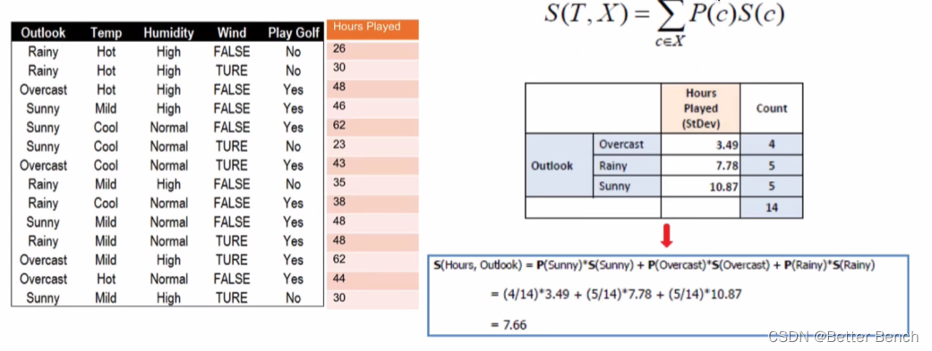举例理解,以下是一个打高尔夫球的时间表。根据天气、适度、温度、风来预测打高尔夫的时间长短。