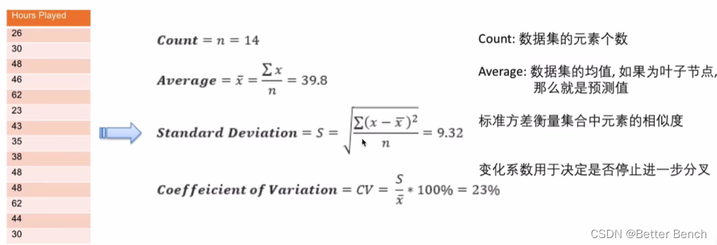 2 回归树分支标准回归树的选择分支节点的评价指标是标准方差(Standard Deviation)。回归树使用某一种特征将原集合分为多个子集,用标准方差衡量子集中的元素是否相近,越小表示越相近。