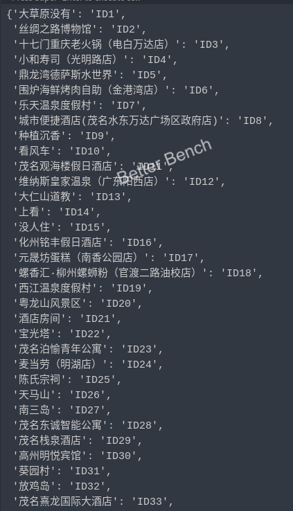 {'周黑鸭(东汇城店)': 0, '茂名文华酒店': 1, '旅游度假区': 2, '古郡水城': 3, '南三岛': 4, '红树林公园': 5, '信宜酒店': 6, '菠斯蒂蛋糕': 7}
