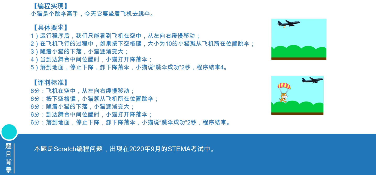 三、评分标准6分∶飞机在空中﹐从左向右缓慢移动; 6分:按下空格键,小猫就从飞机所在位置跳伞; 6分∶随着小猫的下落﹐小猫逐渐变大﹔ 6分:到达舞台中间位置时