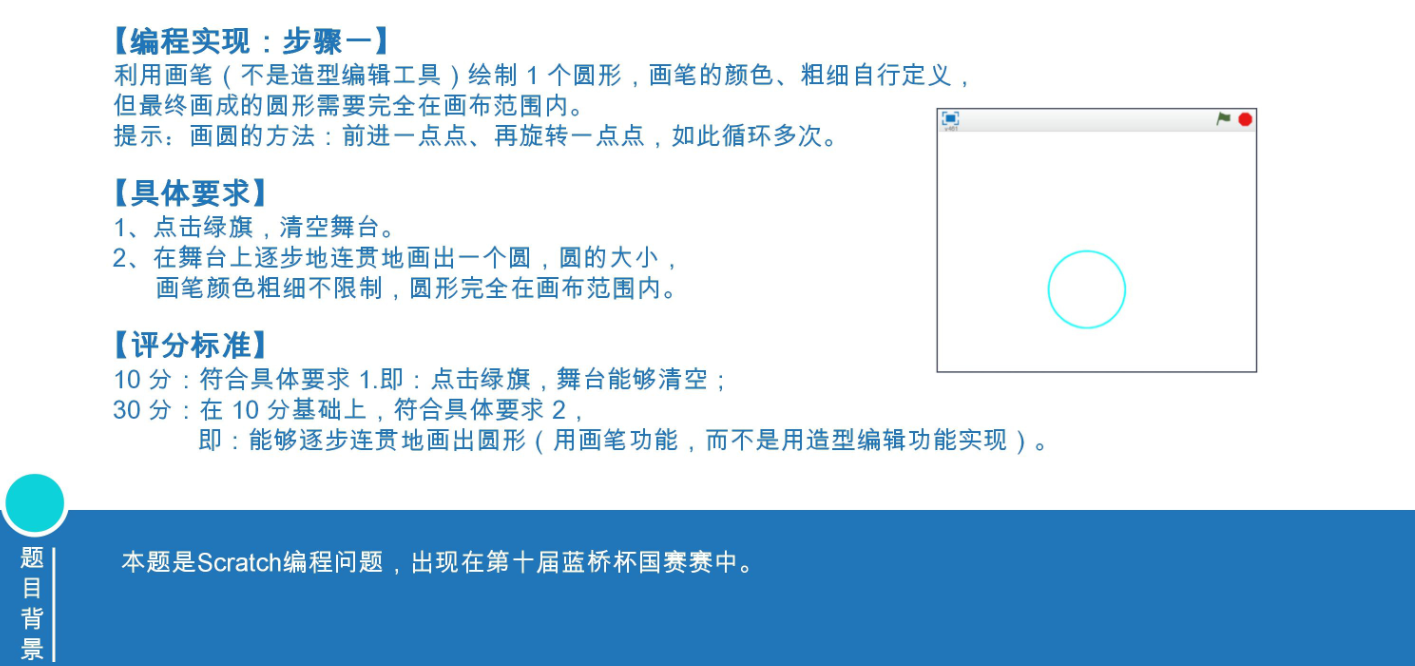 具体要求: 1、点击绿旗﹐清空舞台。 2、在舞台上逐步地连贯地画出一个圆,圆的大小, 画笔颜色粗细不限制,圆形完全在画布范围内。