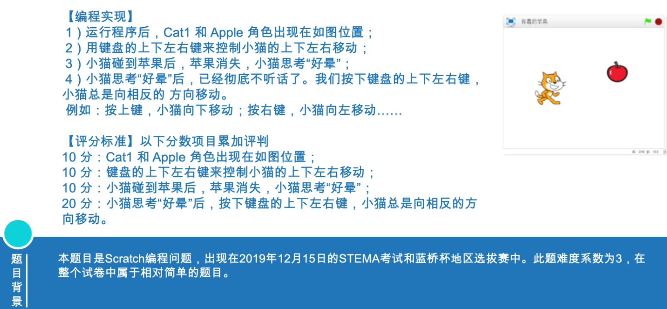 本题目是Scratch编程问题,出现在2019年12月15日的STEMA考试和蓝桥杯地区选拔赛中。此题难度系数为3,在整个试卷中属于相对简单的题目。