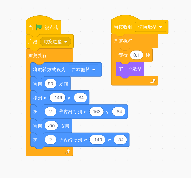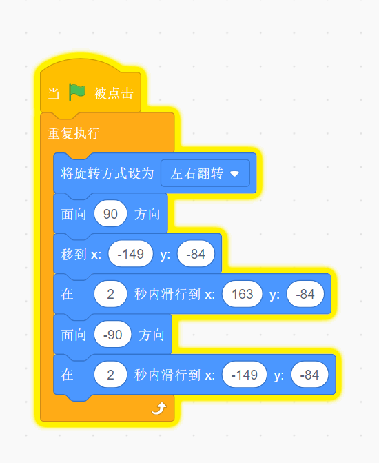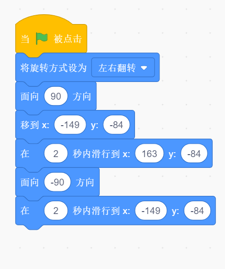 二、编程实现1)小猫从坐标点(-144 , -81)出发向右行走﹔ 2)当走到长椅最右端时,转头向左行走回到起点﹔ 3)然后再转头向右,就这样重复循环地行走下去。