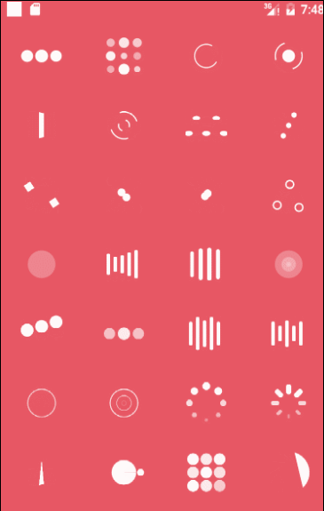 voidstartAnim(){ avi .show(); // or avi.smoothToShow();} voidstopAnim(){ avi .hide(); // or avi.smoothToHide();} Custom Indicator
