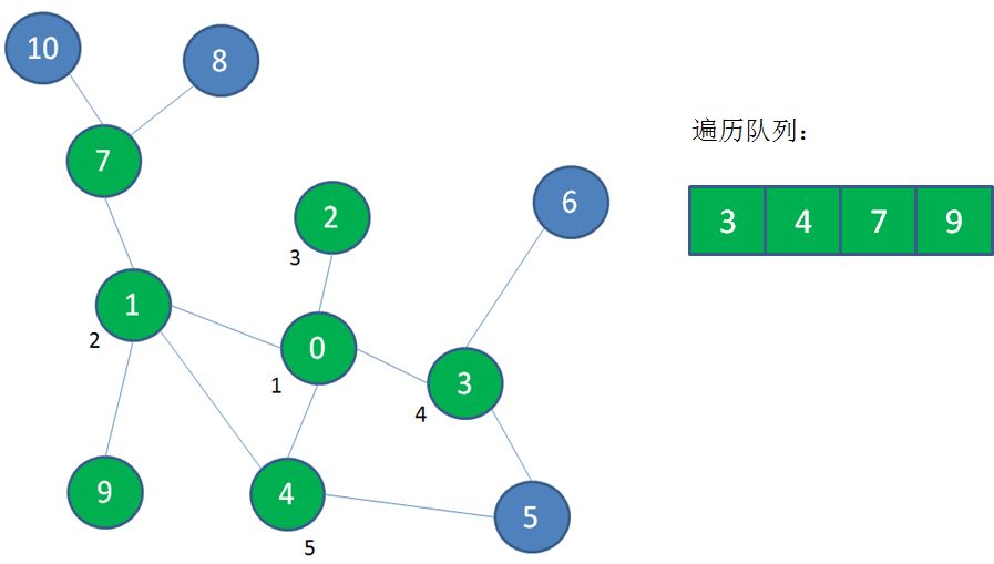 然后顶点1出队,遍历顶点1的邻近顶点7、9,并且把它们入队: