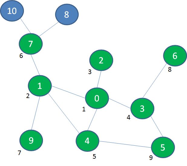 而后我们探索了顶点10,又无路可走了,这时候我们要从顶点10退回到顶点7,再退回到顶点1。