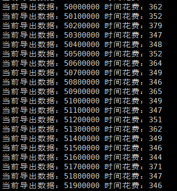 下边是每十万行打印一次,时间单位为毫秒。前五千万行,基本上速度是十万行 300多毫秒