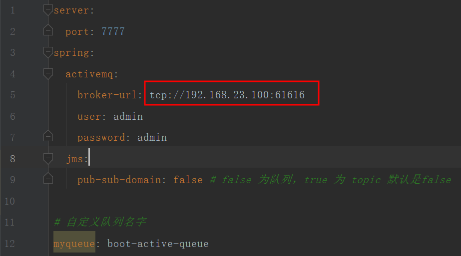 下边的是正确的配置,ip地址是你放MQ 的地址。如果没有配置默认的MQ 的配制的话,端口就是 61616