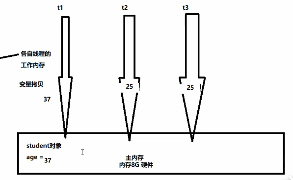 上边三个代表的是三个不同的线程,下边代表的是主内存。所有的变量都存在主内存上,每个线程都有自己的工作内存,当线程用到变量的时候,就去主内存复制一份,如果需要修改,则在自己的内存空间修改,修改完了更新到主内,主内存会通知所有复制过这个变量的线程。这就是可见性的体现。