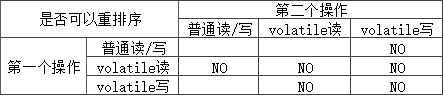 JMM 会针对编译器制定 volatile 重排序规则表。 NO表示禁止重排序。