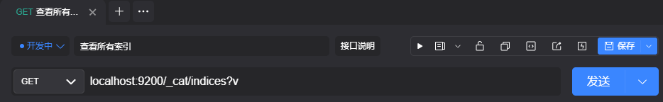 在 ApiPost 中,向 ES 服务器发 GET 请求:localhost:9200/_cat/indices?v 这里请求路径中的 _cat 表示查看的意思,indices 表示索引,所以整体含义就是查看当前 ES 服务器中的所有索引,服务器响应结果如下: