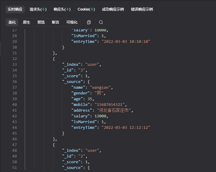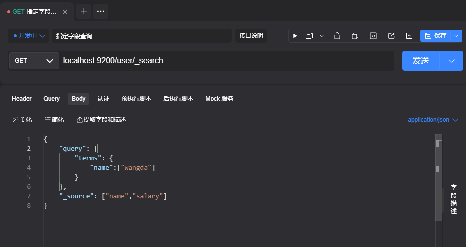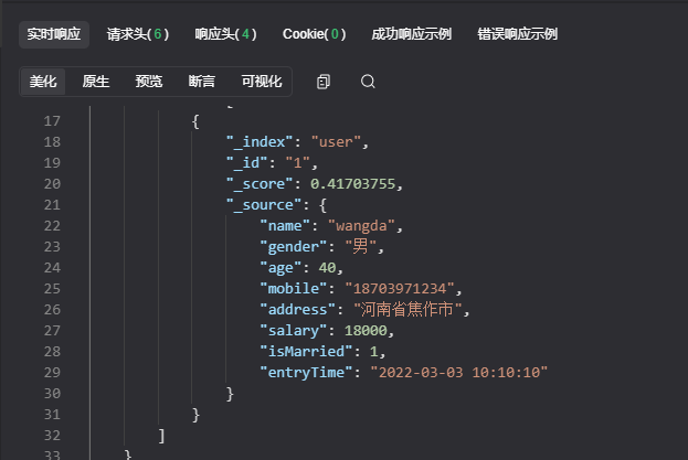 假定我们想要结合使用 salary 和 age 进行查询,并且匹配的结果首先按照 salary 排序,然后按照 age 排序 在ApiPost 中,向 ES 服务器发 GET 请求:localhost:9200/user/_search