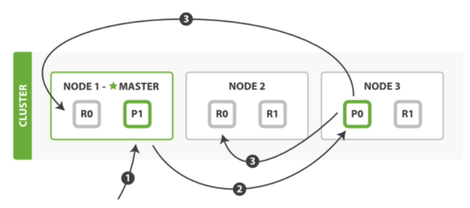- 读写可以请求任意节点,节点在通过转发请求到目的节点,比如一个文档的新增,文档通过路由算法分片到某个主分片,然后找到对应的节点,将数据写入到主分片上,然后在同步到副分片上。