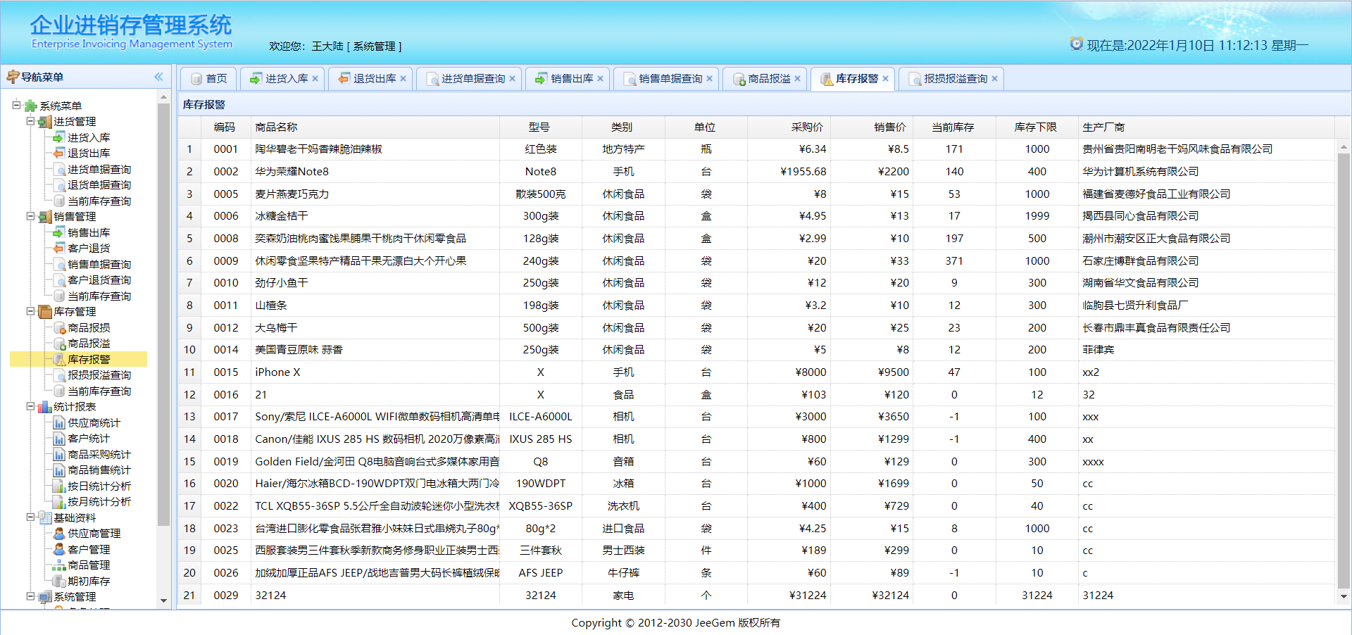 系统菜单 进货管理 销售管理 库存管理 统计报表 基础资料 系统管理 进货入库 退货出库 进货单据查询 退货单据查询 当前库存查询 销售出库 客户退货 销售单据查询 客户退货查询 当前库存查询 商品报损 商品报溢 库存报警 报损报溢查询 当前库存查询 供应商统计 客户统计 商品采购统计 商品销售统计 按日统计分析 按月统计分析 供应商管理 客户管理 商品管理 期初库存 角色管理 用户管理 系统日志 修改密码 安全退出