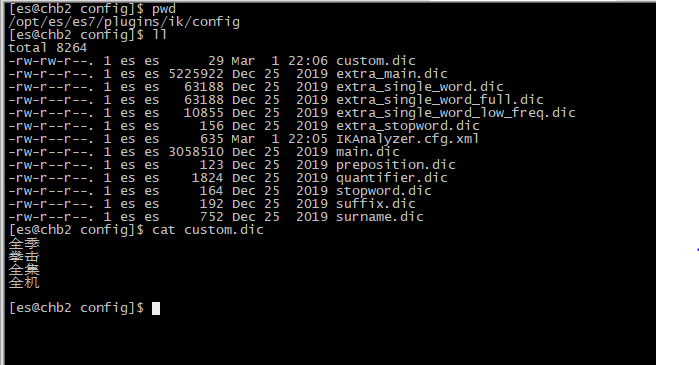 3.2、配置自定义词库1、配置自定义词库文件 对于部分专业词语,我们不想进行分词,所以ik分词器提供自定义词库 修改plugins/ik/config/IKAnalyzer.cfg.xml,可以使用本地自定义词库,也可以使用远程分词库(建议使用远程,这样不用每次重启es集群)