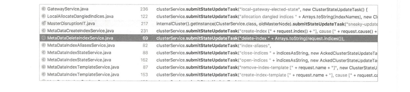- ClusterStateTaskConfig:任务的配置信息,包括超时和优先级。任务类ClusterStateUpdateTask实现了这三个接口,总体来说就是要定义执行的任务,以及实现一些事件通知函数。当某个模块提交任务时,使用下面的简单方式: