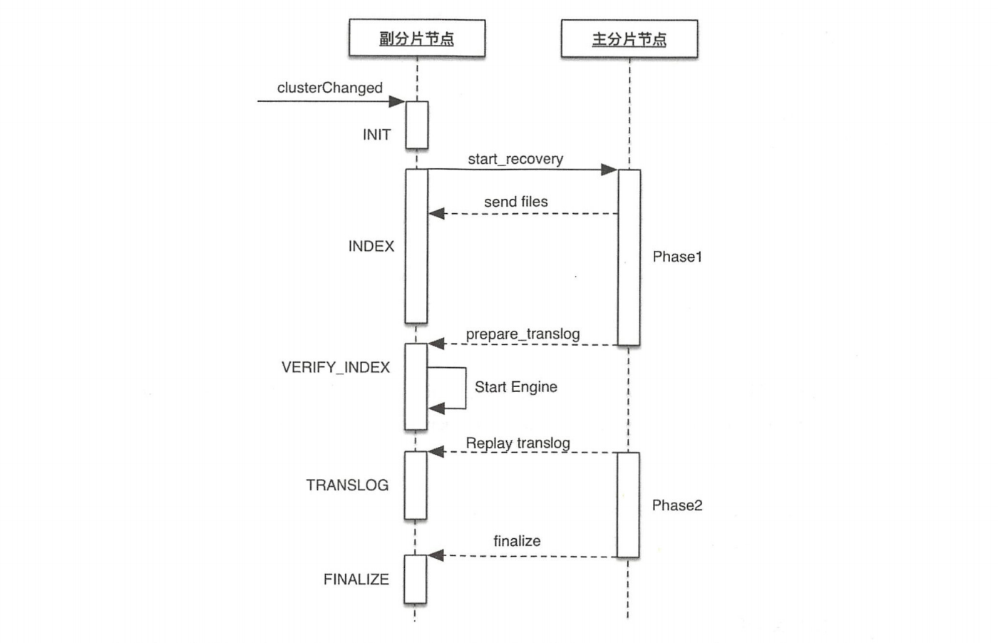 - 副分片恢复的主要阶段是 INDEX和TRANSLOG 阶段