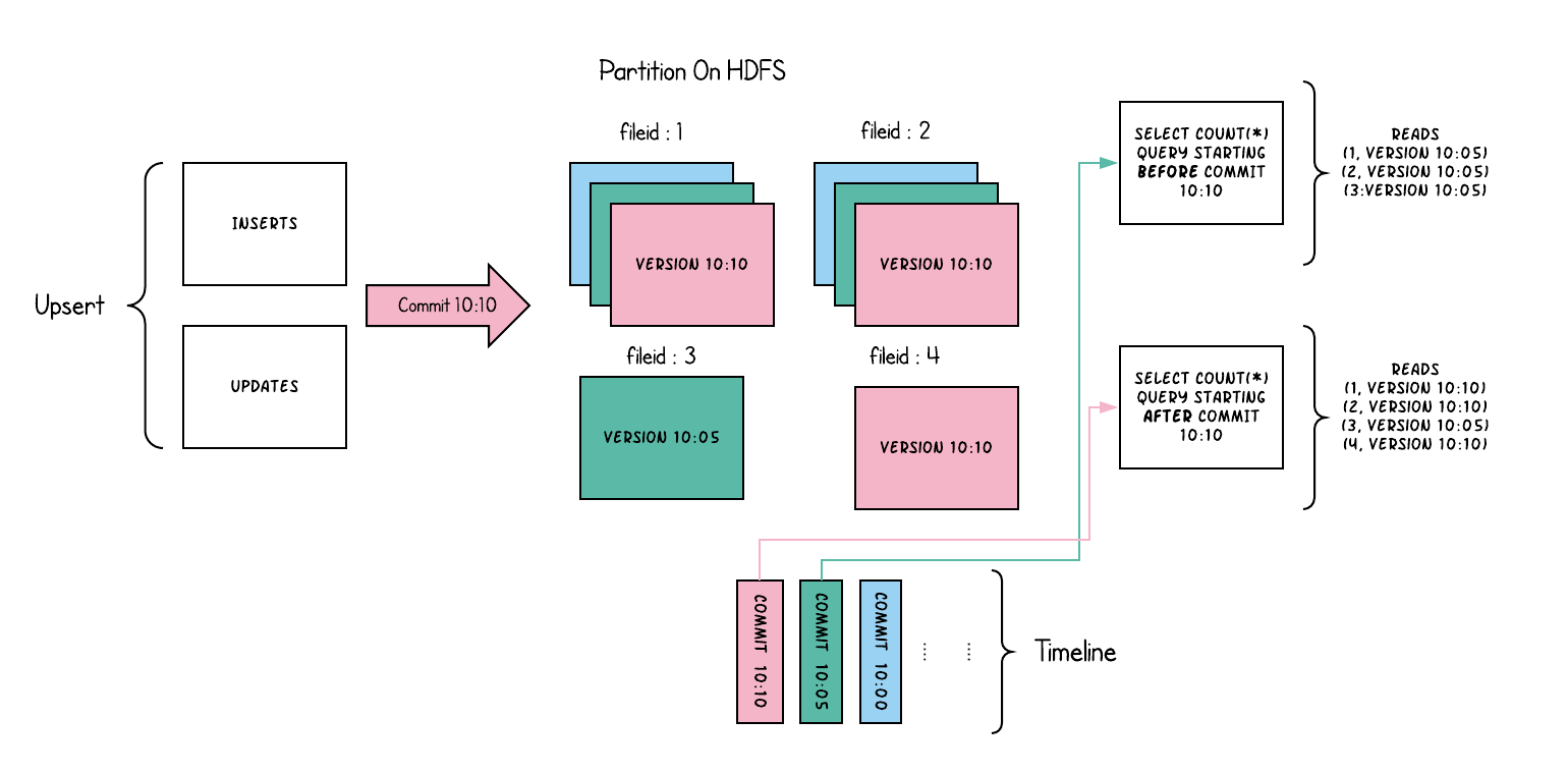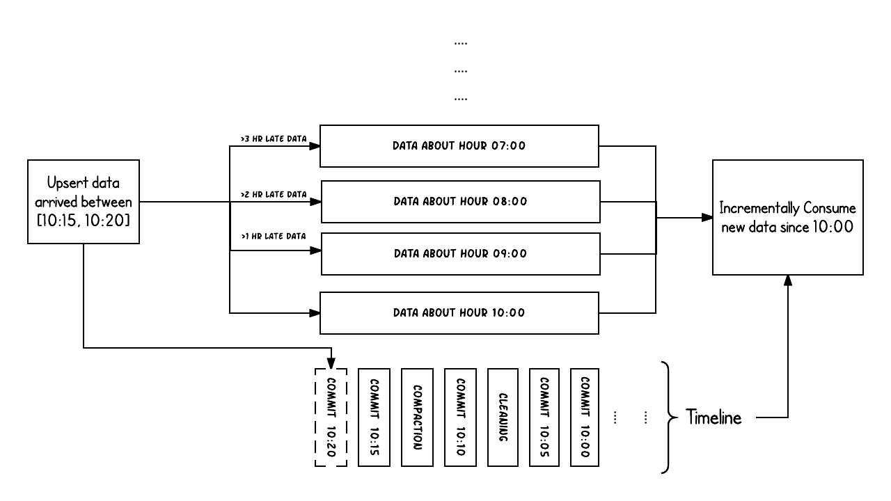 上图中采用时间(小时)作为分区字段,从 10:00 开始陆续产生各种 commits,10:20 来了一条 9:00 的数据,该数据仍然可以落到 9:00 对应的分区,通过 timeline 直接消费 10:00 之后的增量更新(只消费有新 commits 的 group),那么这条延迟的数据仍然可以被消费到。