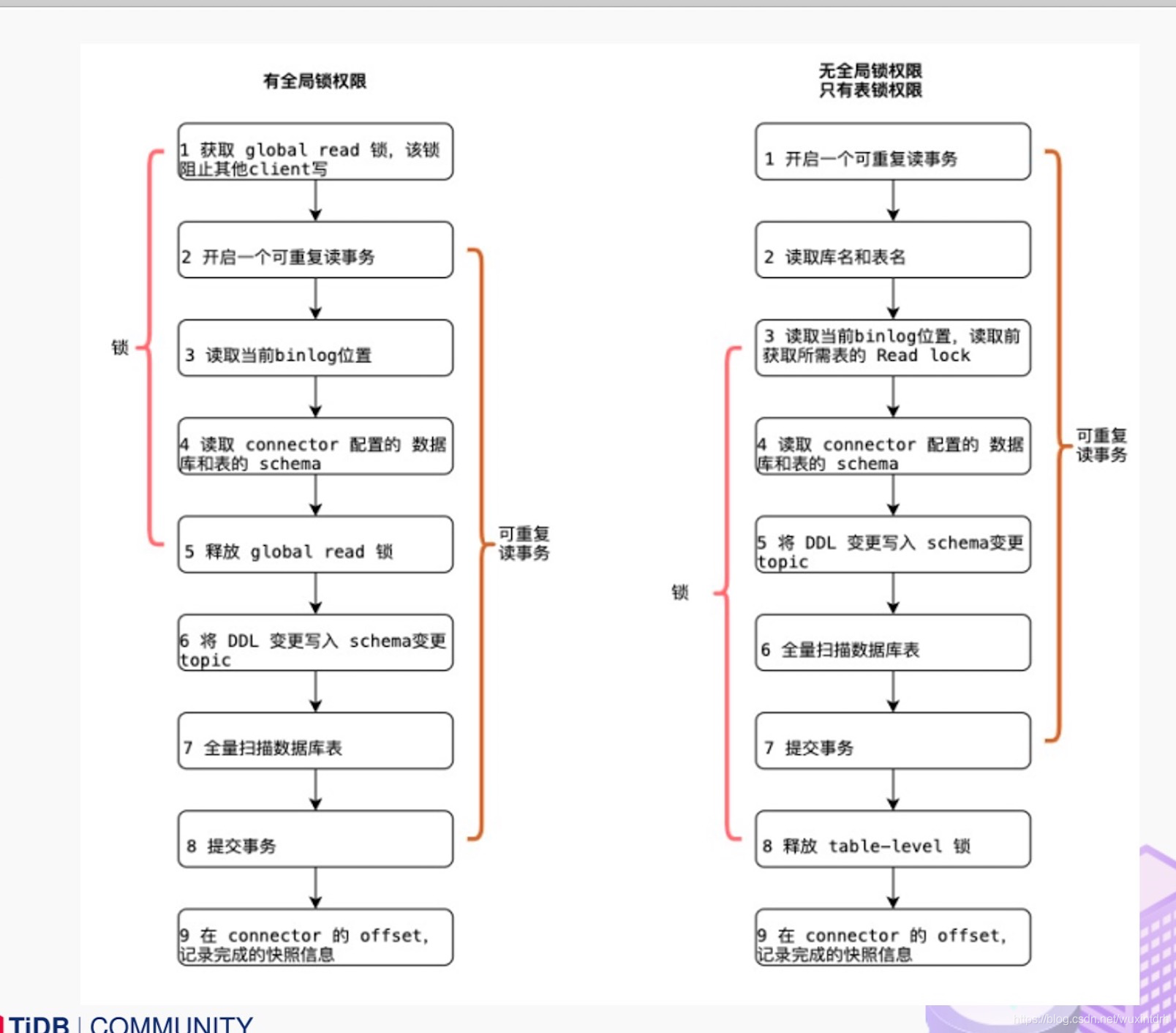 以全局锁为例,首先是获取一个锁,然后再去开启可重复读的事务。这里锁住操作是读取 binlog 的起始位置和当前表的 schema。这样做的目的是保证 binlog 的起始位置和读取到的当前 schema 是可以对应上的,因为表的 schema 是会改变的,比如如删除列或者增加列。在读取这两个信息后,SnapshotReader 会在可重复读事务里读取全量数据,在全量数据读取完成后,会启动 BinlogReader 从读取的 binlog 起始位置开始增量读取,从而保证全量数据 + 增量数据的无缝衔接。