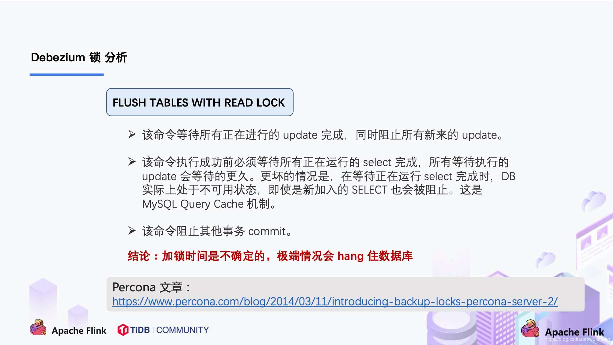 Flink CDC 默认使用无锁模式,能够满足大部分场景,但牺牲了一定的数据准确性。Flink CDC 也支持配置锁模式,虽然能保证数据一致性,但存在上述 hang 住数据的风险。