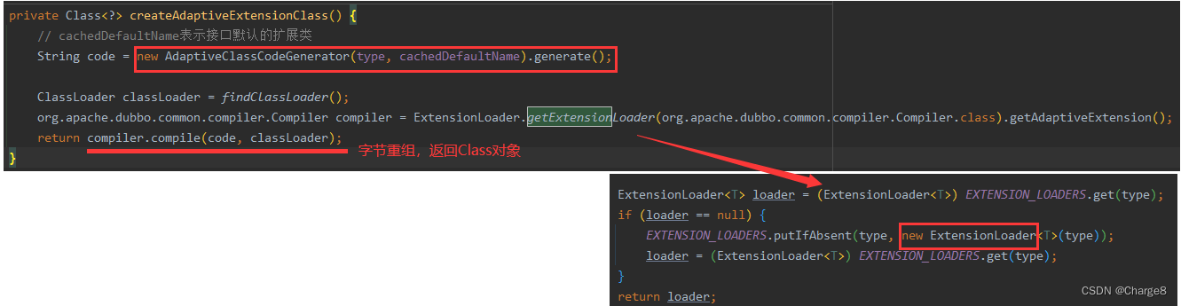 进入 createAdaptiveExtensionClass方法。动态编译生成字符串类(字节重组),生成 .class文件加载到 JVM中并返回。
