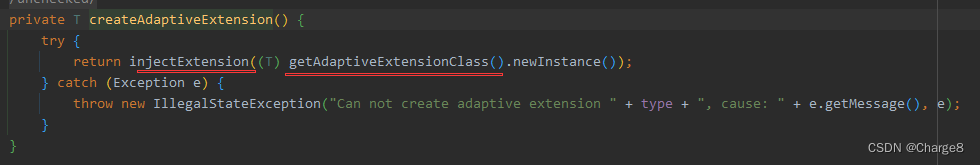 createAdaptiveExtensionClass方法就是Dubbo中默认生成 Adaptive类实例的逻辑。这个实例就是当前这个接口的⼀个代理对象。