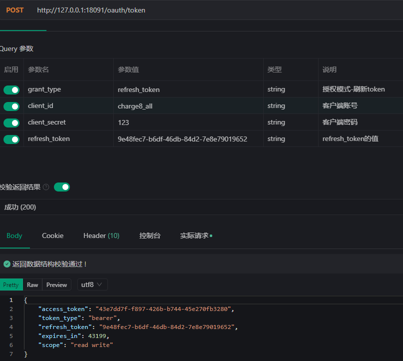 这里使用密码模式令牌来测试,刷新 token。 参数说明: