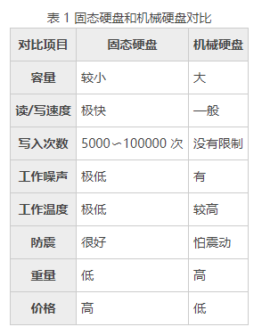 固态硬盘(Solid State Disk, 简称SSD):内部不存在任何盘片的机械部件,通过闪存颗粒来存储数据,读写速度快,价格相对贵。