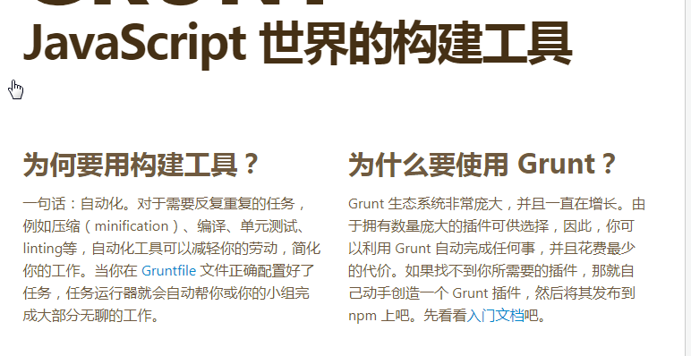 Grunt是基于Node.js的项目构建工具;是基于javaScript上的一个很强大的前端自动化工具,基于NodeJs用于自动化构建、测试、生成文档的项目管理工具,在cmd命令行中执行以下命令: