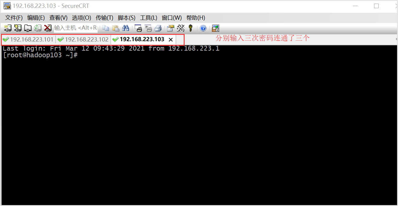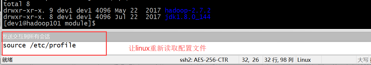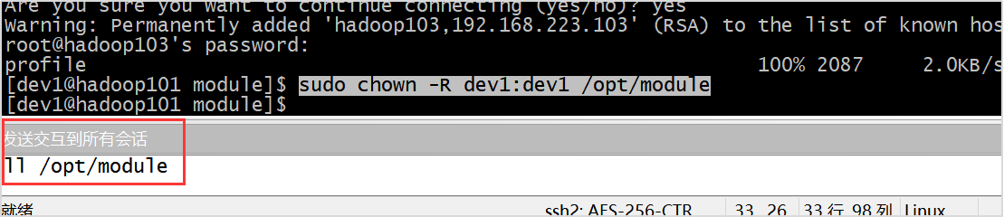 这里hadoop101 hadoop102 hadoop103 一起发送指令在下面小框里输入命令,右键 发送交互到所有会话
