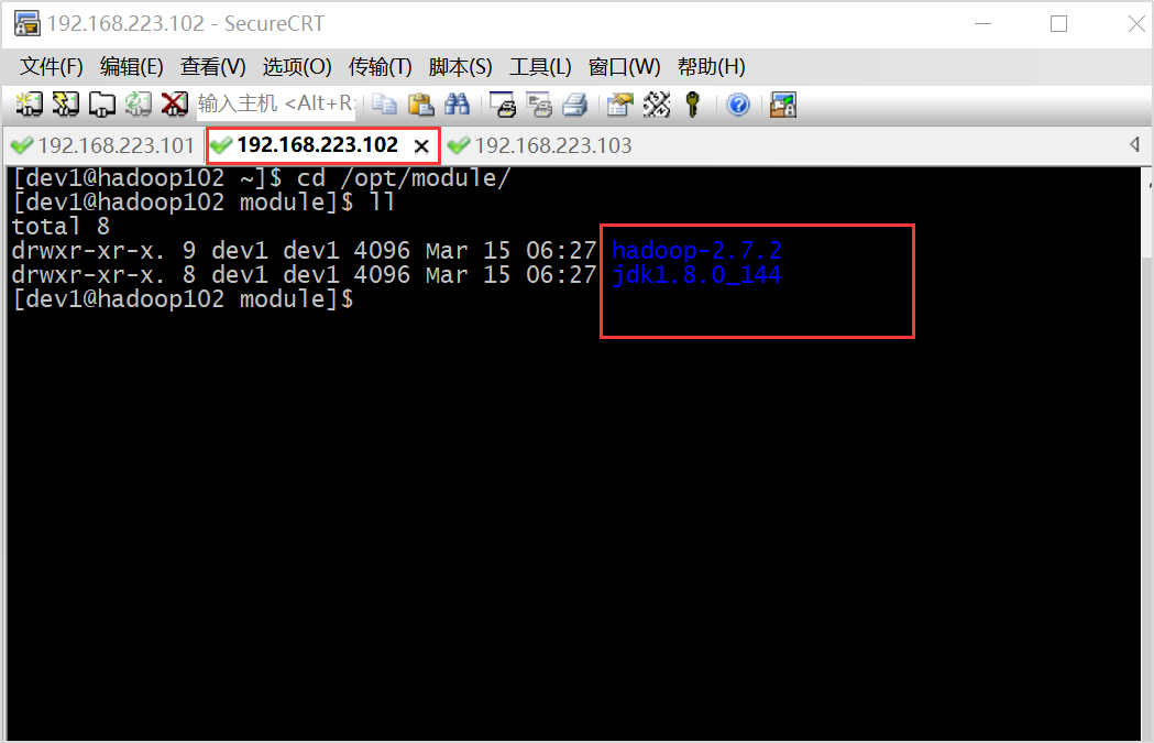 在hadoop101上,将hadoop101中/opt/module/目录下的文件拷贝到hadoop102上