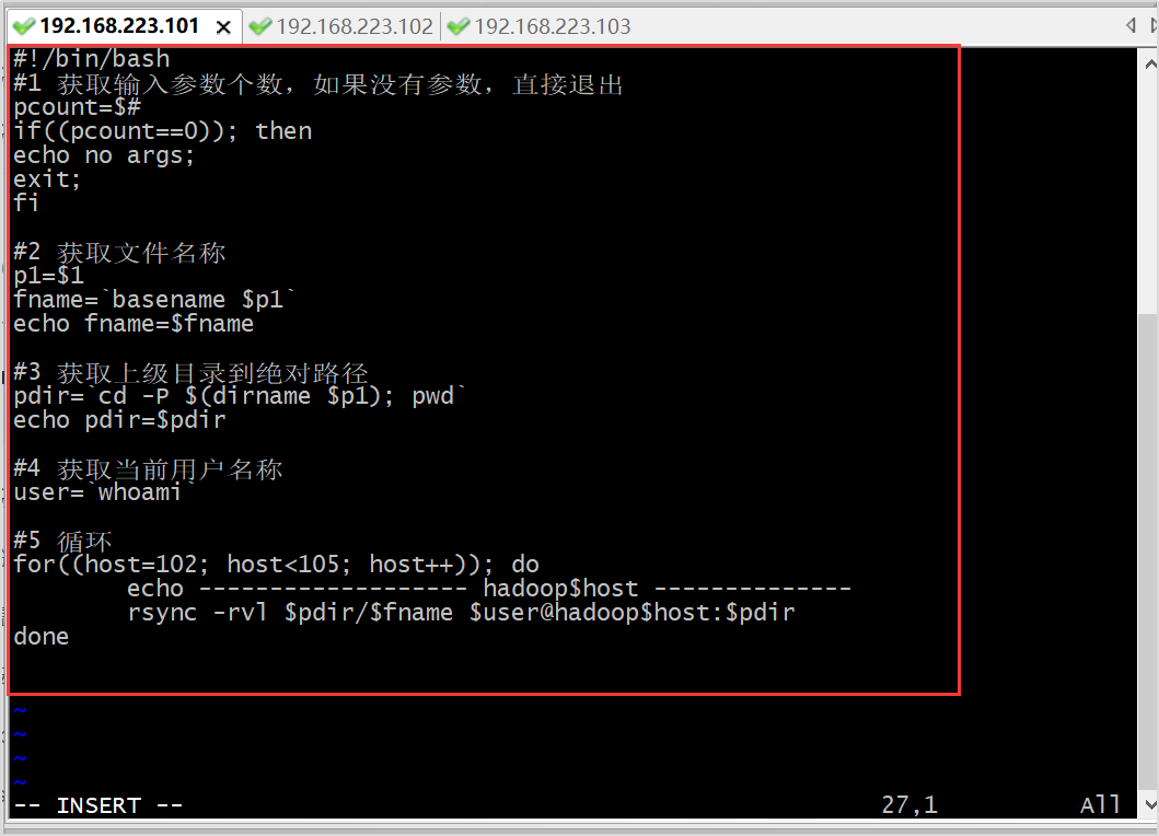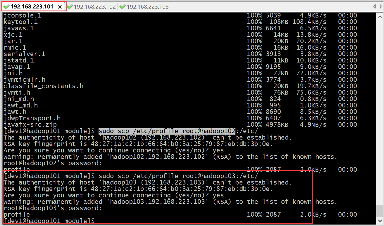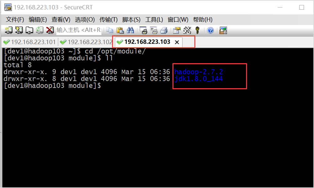 在hadoop101上,将hadoop101中/opt/module/目录下的文件拷贝到hadoop103上