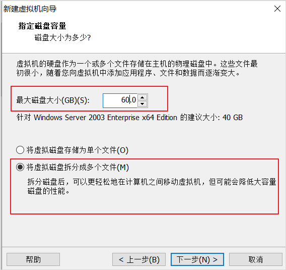 设置磁盘大小,选择拆分为多个文件(磁盘所占的空间很小,存放在操作系统的安装路径中)