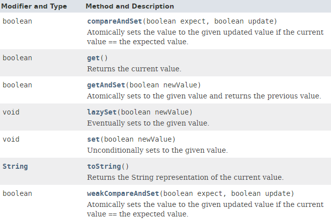 AtomicBooleanpublic class AtomicBoolean implements java.io.Serializable {
