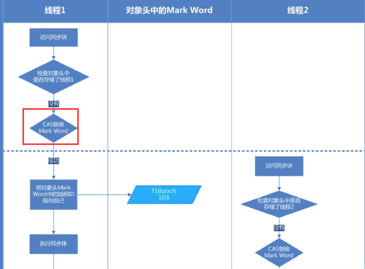 注意这时只是偏向锁的释放,之后会进入到轻量级锁阶段,两个线程进入锁竞争状态,一个具体例子可以参考synchronized锁机制。 注:synchronized锁升级流程如下 第一步,检查MarkWord里面是不是放的自己的ThreadId ,如果是,表示当前线程是处于 “偏向锁” 第二步,如果MarkWord不是自己的ThreadId,锁升级,这时候,用CAS来执行切换,新的线程根据MarkWord里面现有的ThreadId,通知之前线程暂停,之前线程将Markword的内容置为空。 第三步,两个线程都把对象的HashCode复制到自己新建的用于存储锁的记录空间,接着开始通过CAS操作,把共享对象的MarKword的内容修改为自己新建的记录空间的地址的方式竞争MarkWord, 第四步,第三步中成功执行CAS的获得资源,失败的则进入自旋 第五步,自旋的线程在自旋过程中,成功获得资源(即之前获的资源的线程执行完成并释放了共享资源),则整个状态依然处于 轻量级锁的状态,如果自旋失败 第六步,进入重量级锁的状态,这个时候,自旋的线程进行阻塞,等待之前线程执行完成并唤醒自己