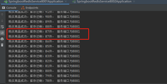System.out.println("购买商品成功,库存还剩:" + realTotal + "件, 服务端口为8001");