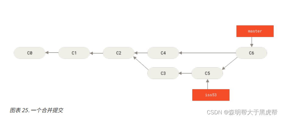 之前介绍过,整合分支最容易的方法是 merge 命令。 它会把两个分支的最新快照(C3 和 C4)以及二者最近的共同祖先(C2)进行三方合并,合并的结果是生成一个新的快照(并提交)。