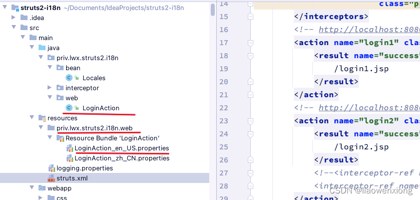 如下图展示在 Maven 项目中将资源文件存放在 LoginAction 所在包目录下: 在 struts.xml 要指明资源文件的具体路径: