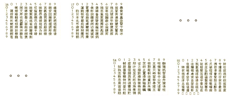 01~09 区表示非汉字的图形字符,共计 682 个字符: 左上角的编号叫“区号”,如上图的