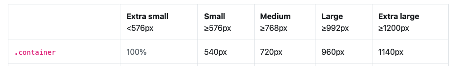 容器分类: 1.1.container :固定宽度显示 如上图所示,container 容器在屏幕的的宽度 ≥576px 时都是有固定的显示宽度的,例如,在 Medium 设备中固定显示的宽度就是 720px,在 Extra small 设备中则 100% 宽度显示,即占满设备屏幕的整个宽度。