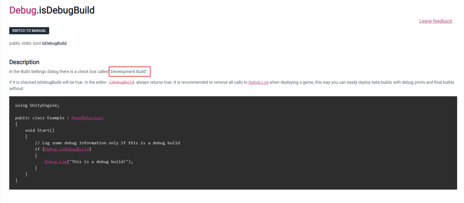 大致意思就是说 我们在写代码想要 打印Log日志 的时候可以使用Debug.isDebugBuild进行判定,只要遇到需要打印Log的时候就使用这个判定,这样后期就可以通过在编辑器选择Development Build是否勾选 来让我们构建的应用是否输出Log,达到一个全局控制Log输出的效果。
